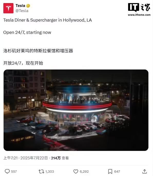 IT之家 7 月 22 日消息,当地时间周一下午 16:20,位于洛杉矶的特斯拉首家超级充电站餐厅(Supercharger Diner)正式宣布面向公众开放,无需特斯拉车辆也可访问。这家餐厅位于洛杉