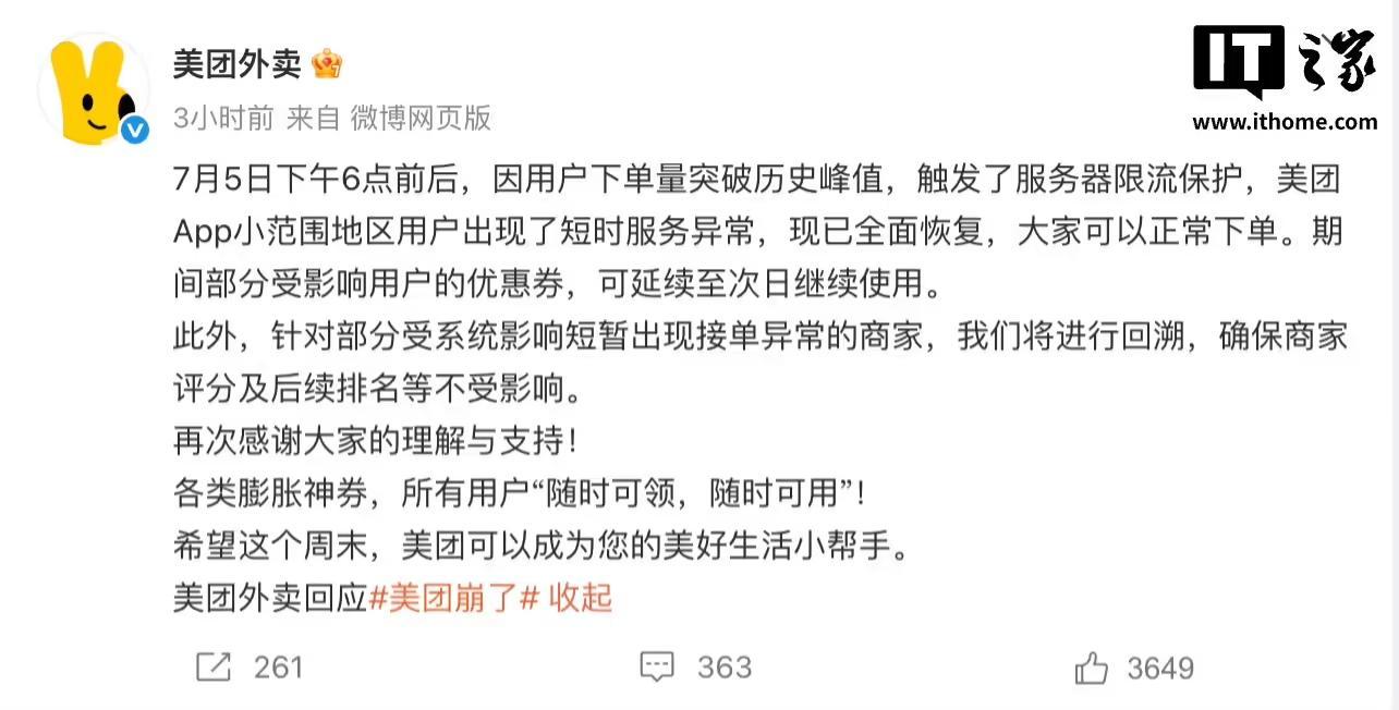 IT之家 7 月 5 日消息,美团外卖官微今天晚间发文对“美团崩了”作出回应,称系用户下单量突破历史峰值,触发服务器限流保护所致。IT之家附官方声明:7 月 5 日下午 6 点前后,因用户下单量突破历