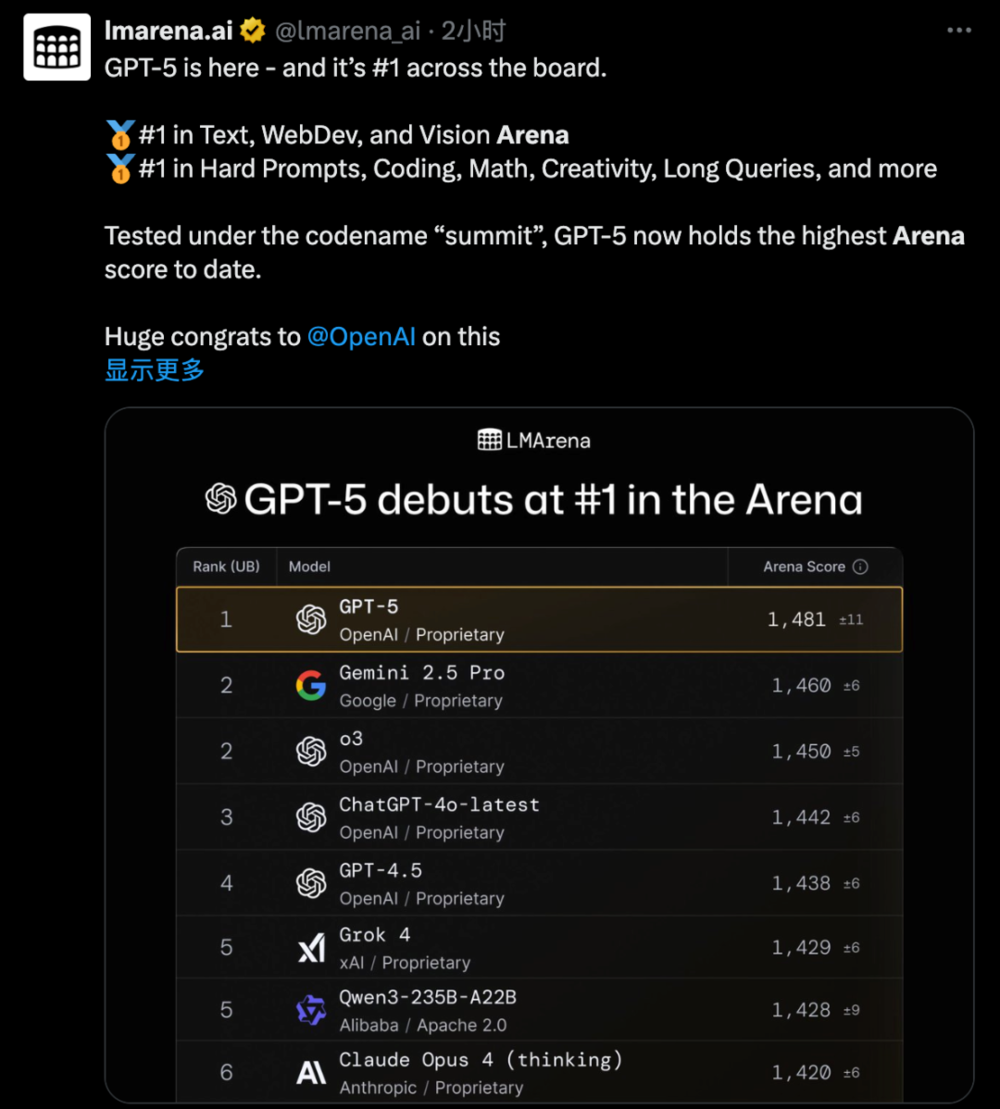 而且比较罕见的是,第三方的大模型竞技场(Imarena.ai)也是及时跟进,直接发表声明:“全方面第一”。