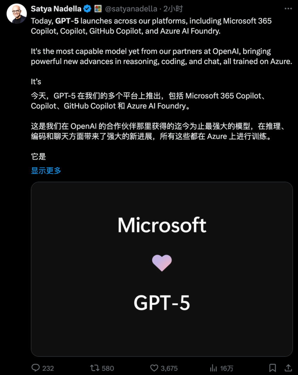 不过另一方面,老东家微软CEO火速出面站台,并配有一个“爱心”图片以表支持: