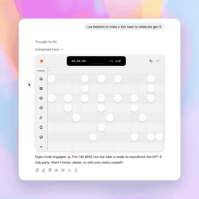 并且Altman还表示,有GPT-5权限的用户,只需发送“use beatbot to make a sick beat to celebrate gpt-5”即可体验。